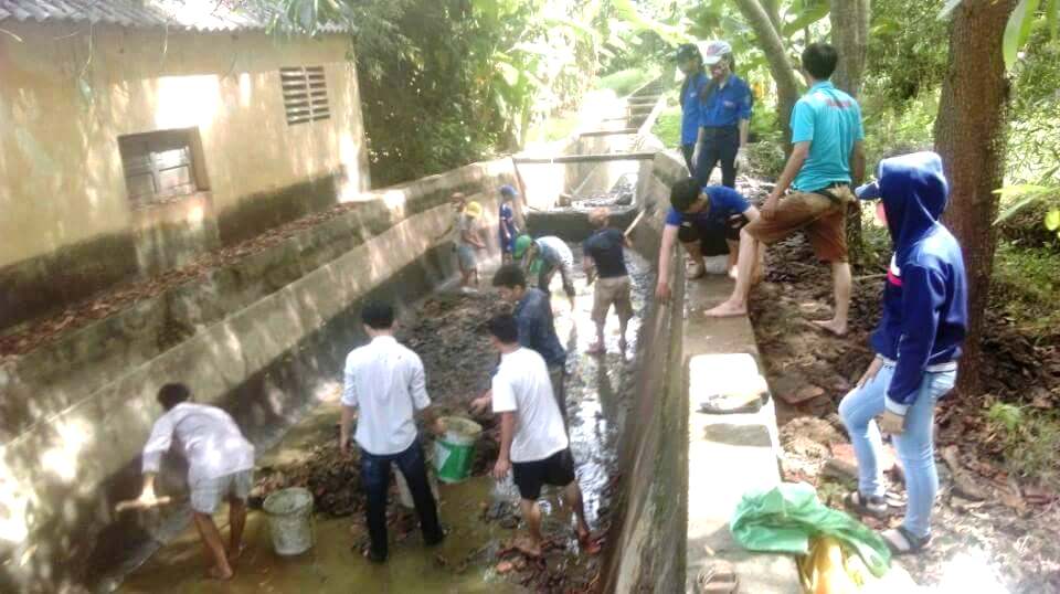 Sau khi đáy bể sạch trơn tru, thầy cô kiếm về nhiều bao lúa bỏ không độn cát vào khâu lại, chất lên chặn lại ở đầu bể thoát nước ra mương ruộng. Từ đó xả nước vào với mực nước chừng 1m. Như vậy, “bể bơi” diện tích hơn 80 mét vuông (dài 20m, rộng 4m) đã thành hình.
